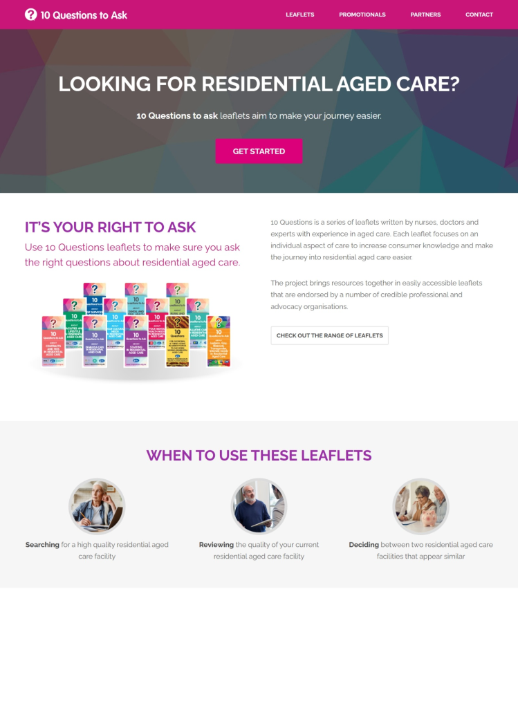 10 Questions is a series of leaflets written by nurses, doctors and experts with experience in aged care. Each leaflet focuses on an individual aspect of care to increase knowledge about the journey to residential aged care. The leaflets are useful when choosing or moving into an aged care home or checking the quality of your current aged care home.