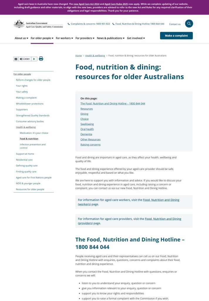 Browse the Aged Care Quality and Safety Commission page on Food, Dining and Nutrition in aged care homes. The resources include a video, factsheet and posters outlining what you can expect from your food and dining experience in an aged care home.