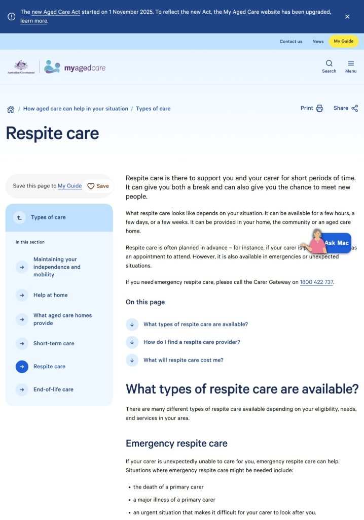 View the page from My Aged Care to understand how you can receive respite care and learn about the different types of care available.